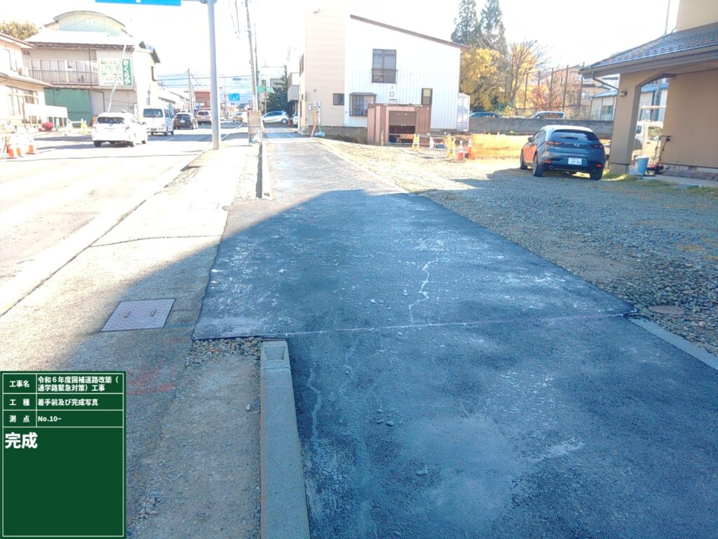 いずれの工事も通学路の拡幅工事となっており、地域の学生・住民の通行をより良くするための工事でありました。市街地の工事であったため、交通量の多い中ではありましたが皆様のご協力があり、無事完成することができました。